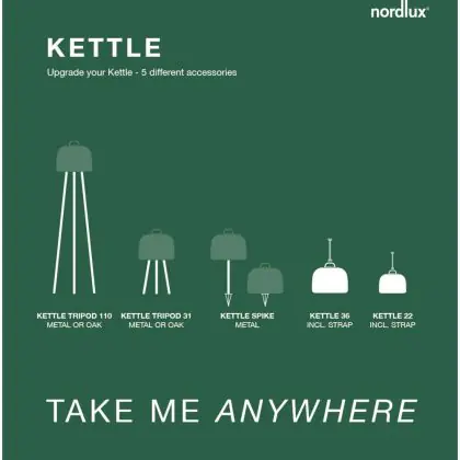 La lampada da tavolo da 360 mm della gamma Kettle di Nordlux è la luce che potete posizionare ovunque ne abbiate bisogno. Su un albero, a terra, in terrazza o sul tavolo. Tutto è possibile. Questa lampada da tavolo ha un grado di protezione IP65 ed è realizzata in plastica dura, resistente al vento e all'acqua.