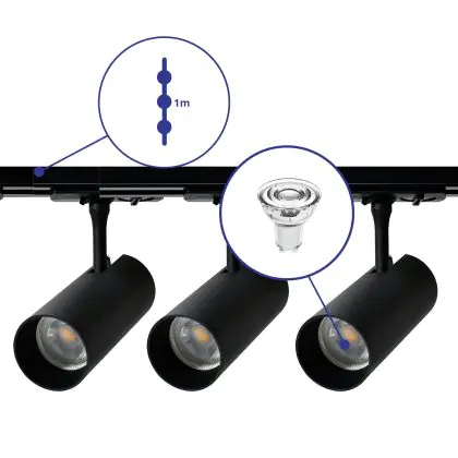 Descrizione Set completo 1-Fase Rail 1 Metro Nero | incl. 3x Faretti + GU10 2700K 3W Dimmerabile + Tappo Di Chiusura, Connettore di Alimentazione