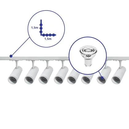 | Nome del fabbricante | Complete L shaped 1-Phase Track Set White incl. 8x Spot fixture + GU10 2700K 3W Dim – 1.5 x 1.5 mete | |